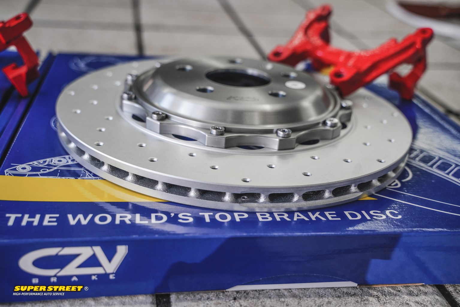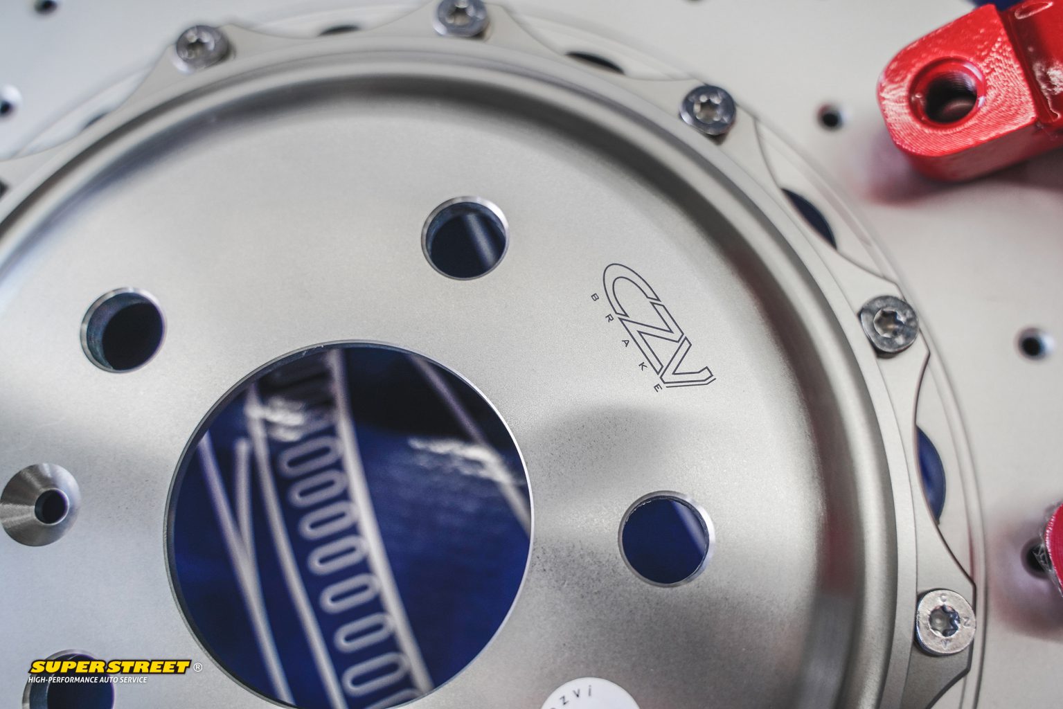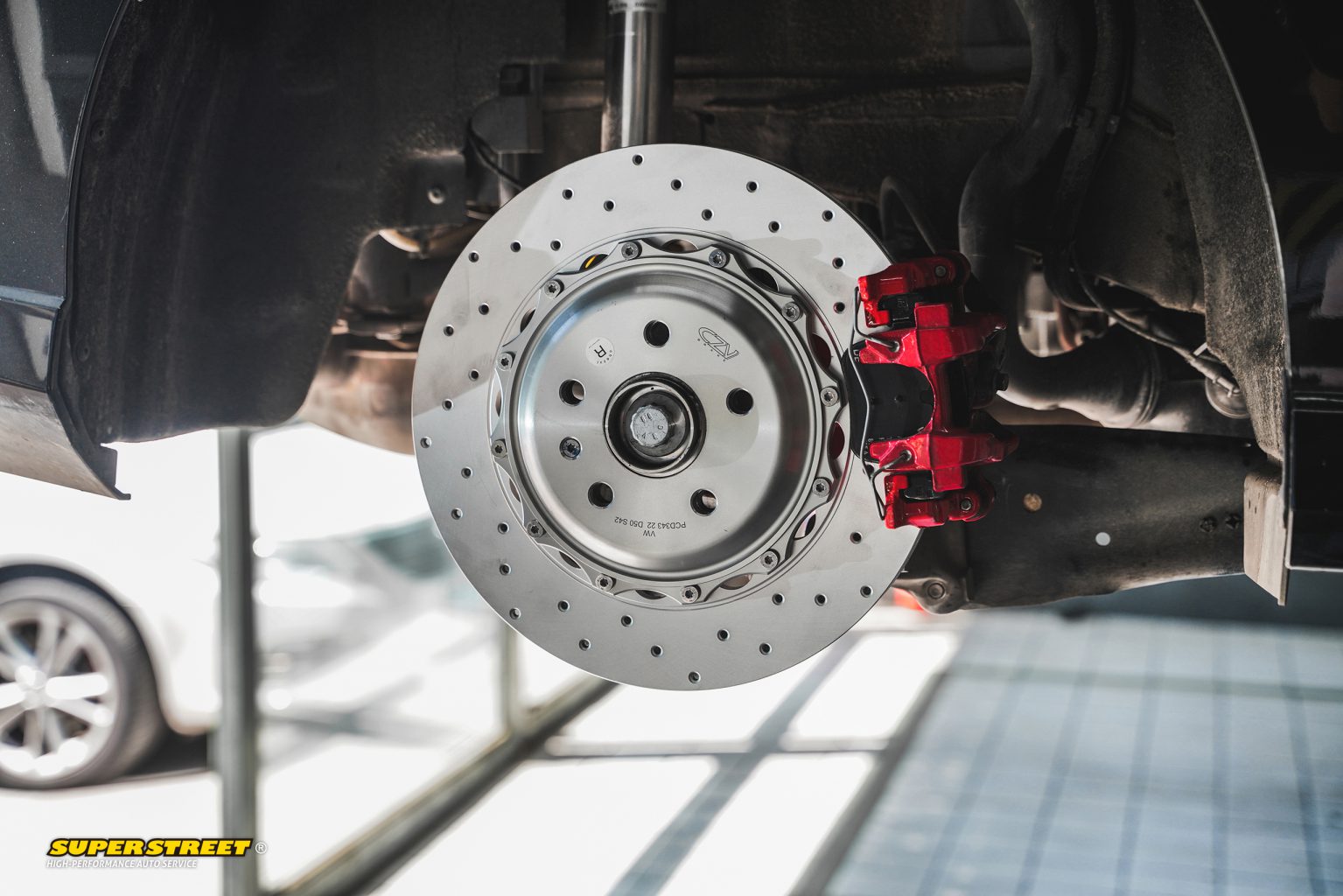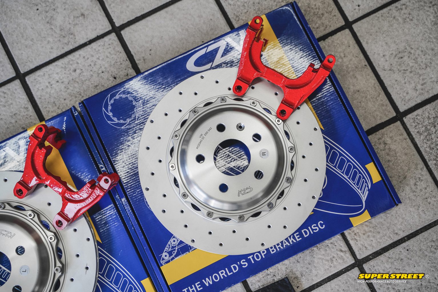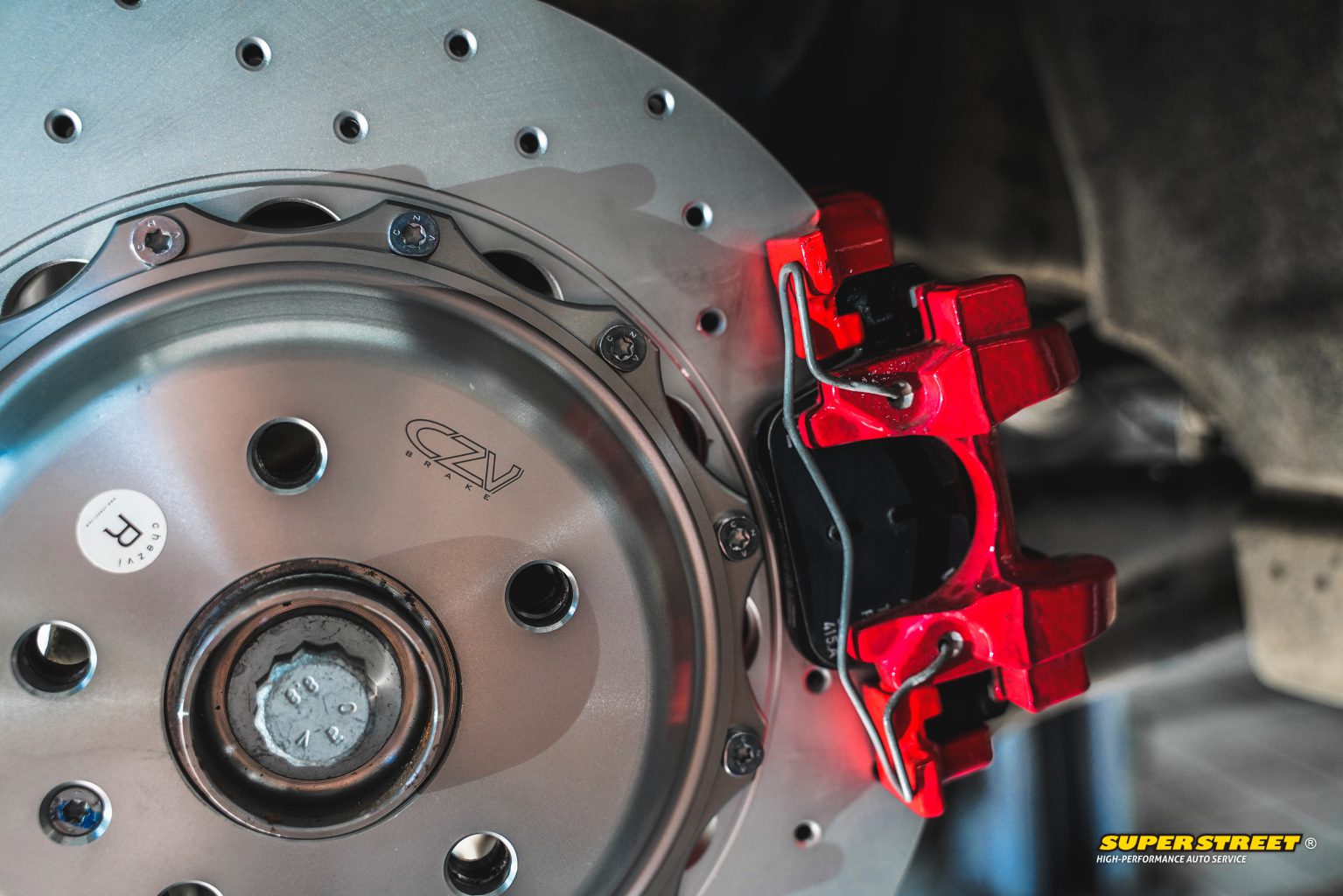 CZV 343X22mm后加大刹车盘;分体打孔通风盘,尺寸加大,提升刹车性能和视觉效果。材料达到欧洲GG20铸铁标准,有效提升10%以上刹车性能。